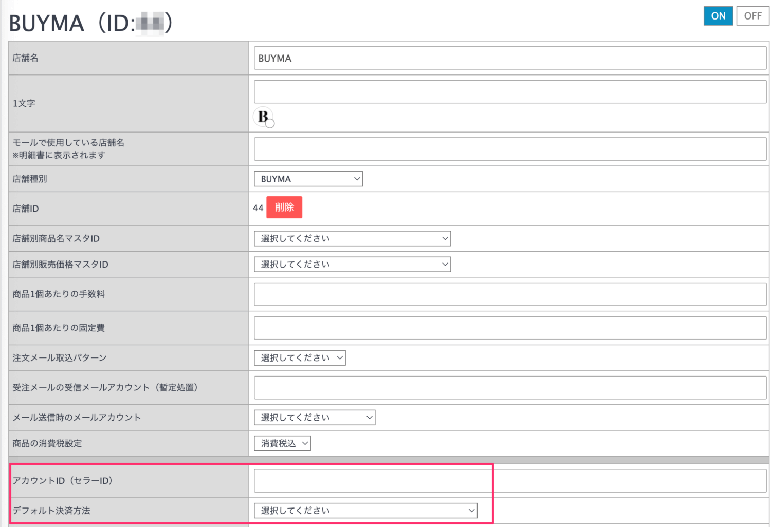 - アカウントID(セラーID)、デフォルト決済方法