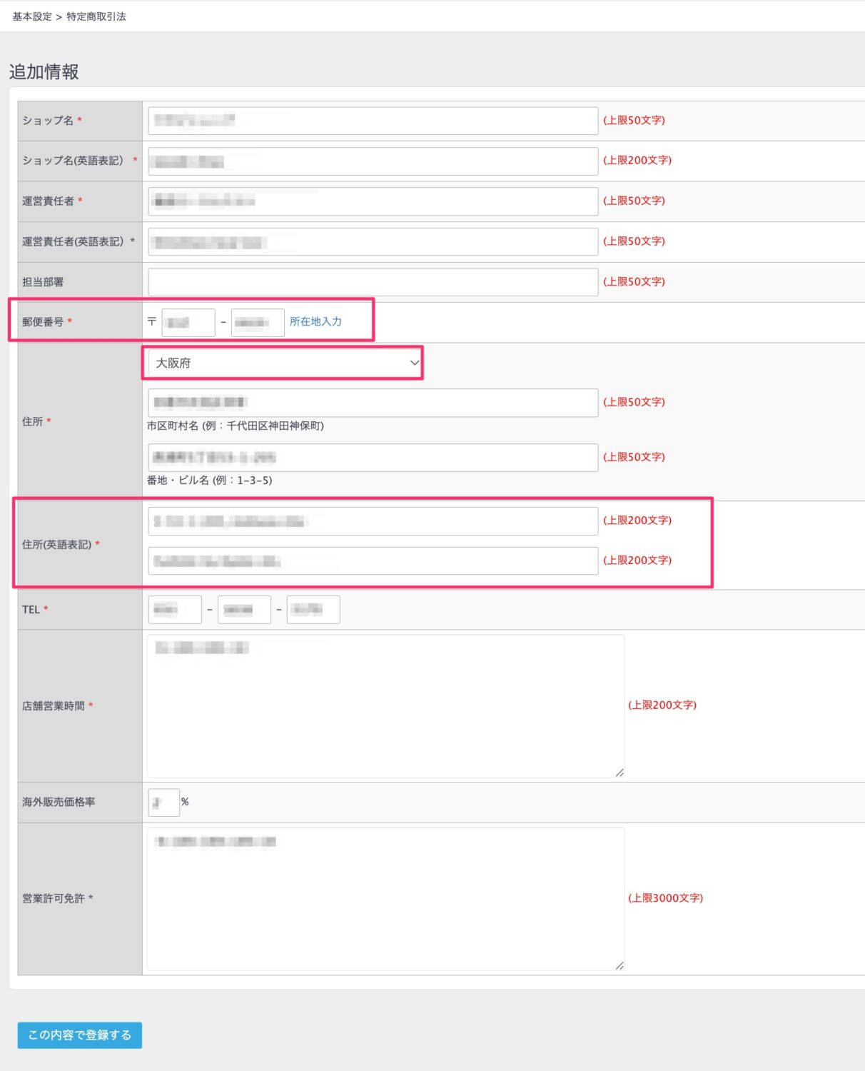 デフォルト設定では、基本設定 > 特定商取引法の以下の項目が自動で出力されます。