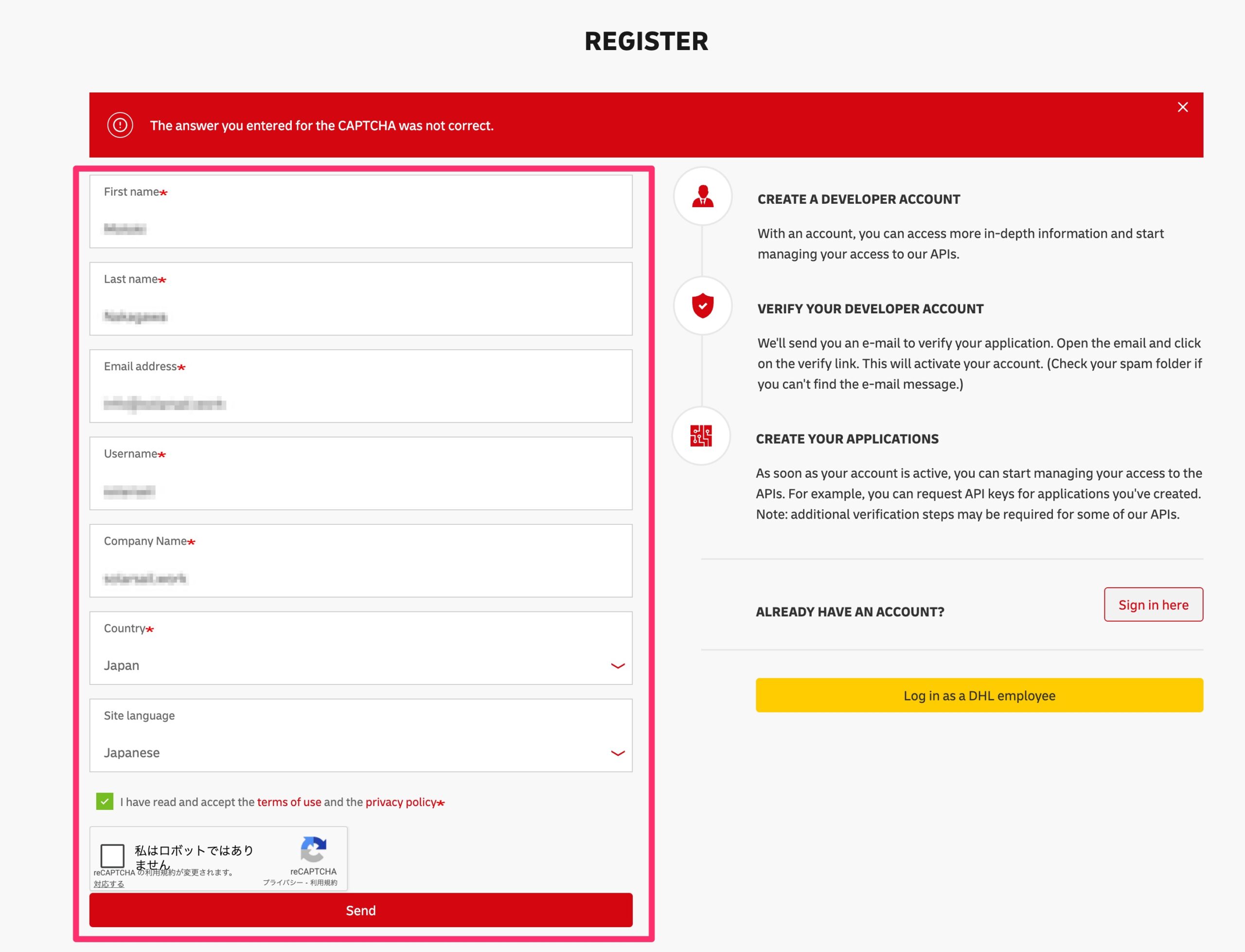 ステップ1 : DHL Developer Portalでアカウント登録を行う