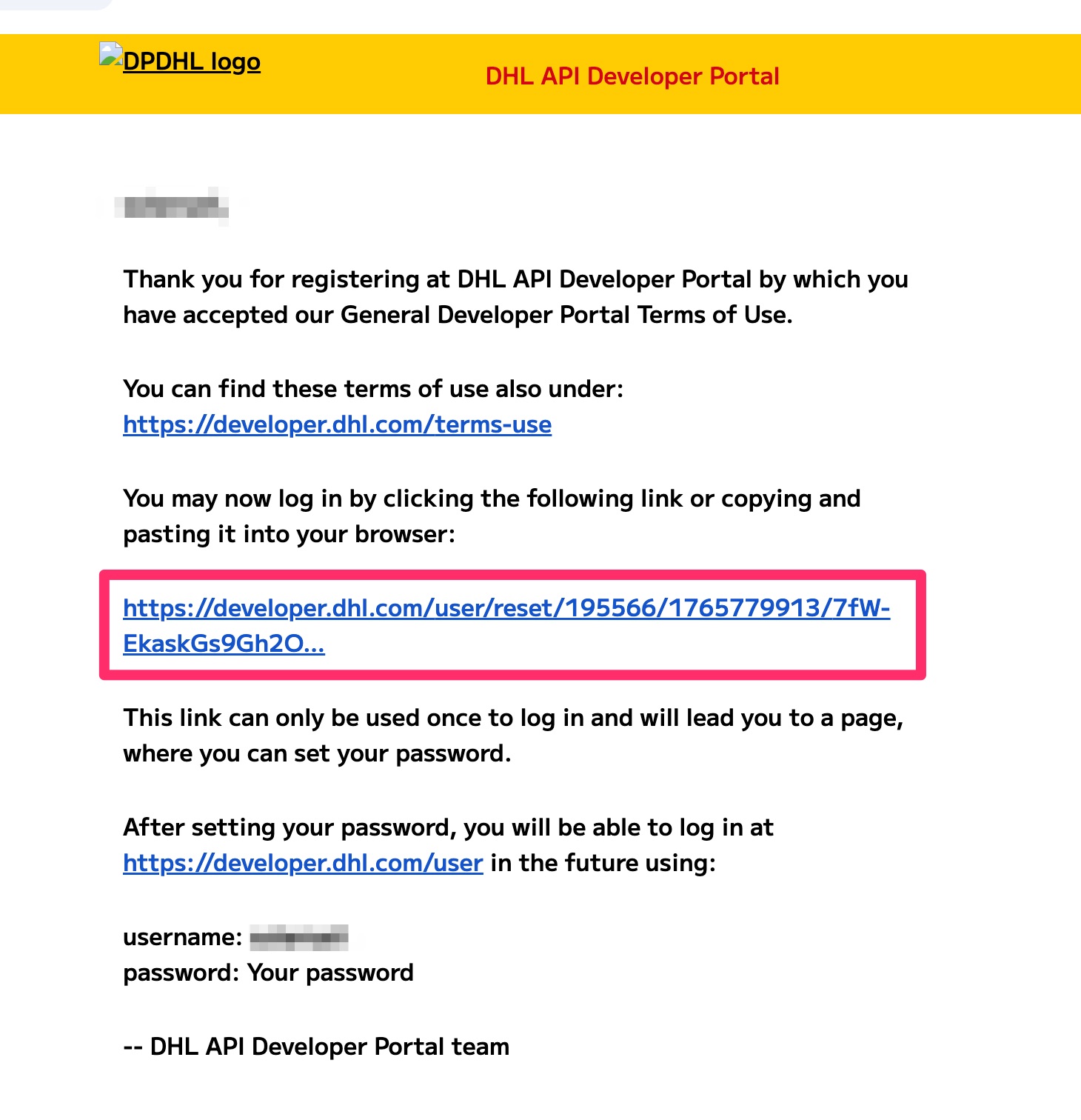 - portal@developer.dhl から、件名 "Account details for [あなたのEメールアドレス] at DHL API Developer Portal" のメールが届きます。