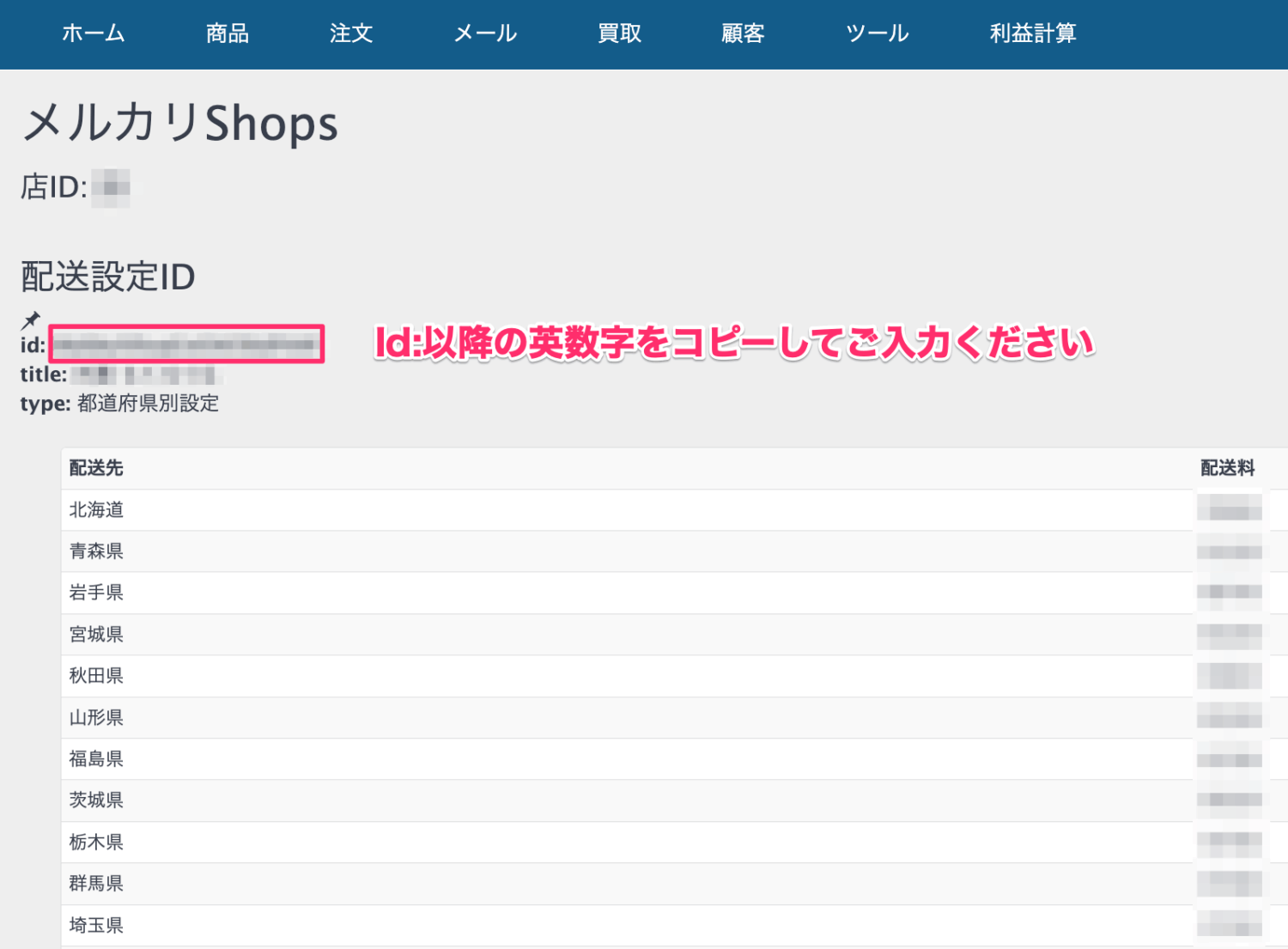 「id: ○○○○○」の○○○○○部分をコピーし、「出品時設定:配送設定ID」にご入力ください。