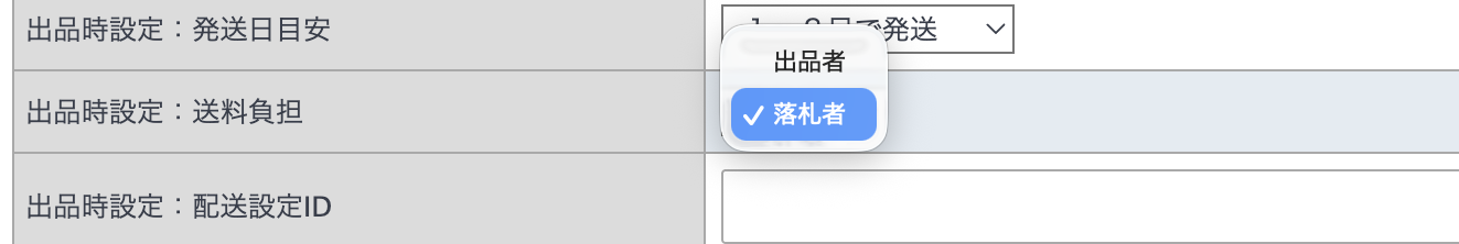 また、送料負担が落札者の場合のみ、「出品時設定:配送設定ID」にて、メルカリShopsの管理画面で設定した、配送設定IDも設定することが可能です。