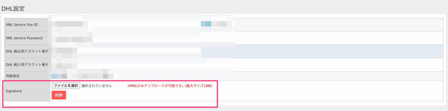 会社設定 > DHL設定の「Signature」にて、社判のPNG画像をアップロードしてください。