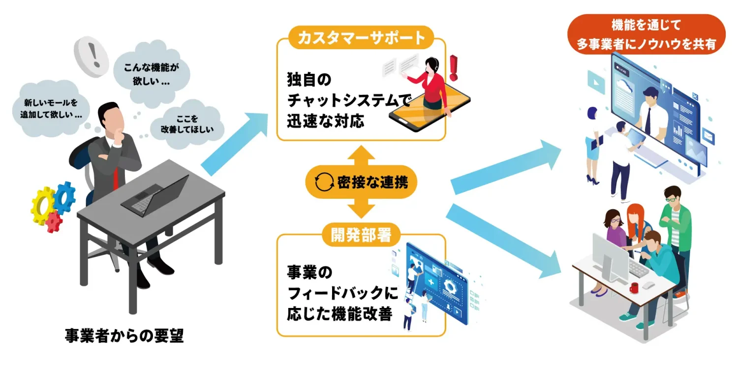 ECモールとは高次元での連携を実現しており、販売促進企画、APIの作り方や連携についての協働支援も実施しています。また、顧客事業者に対しては効率的な利用支援を行い、顧客の声からサービスを改善するなど、価値共創を実現している点。