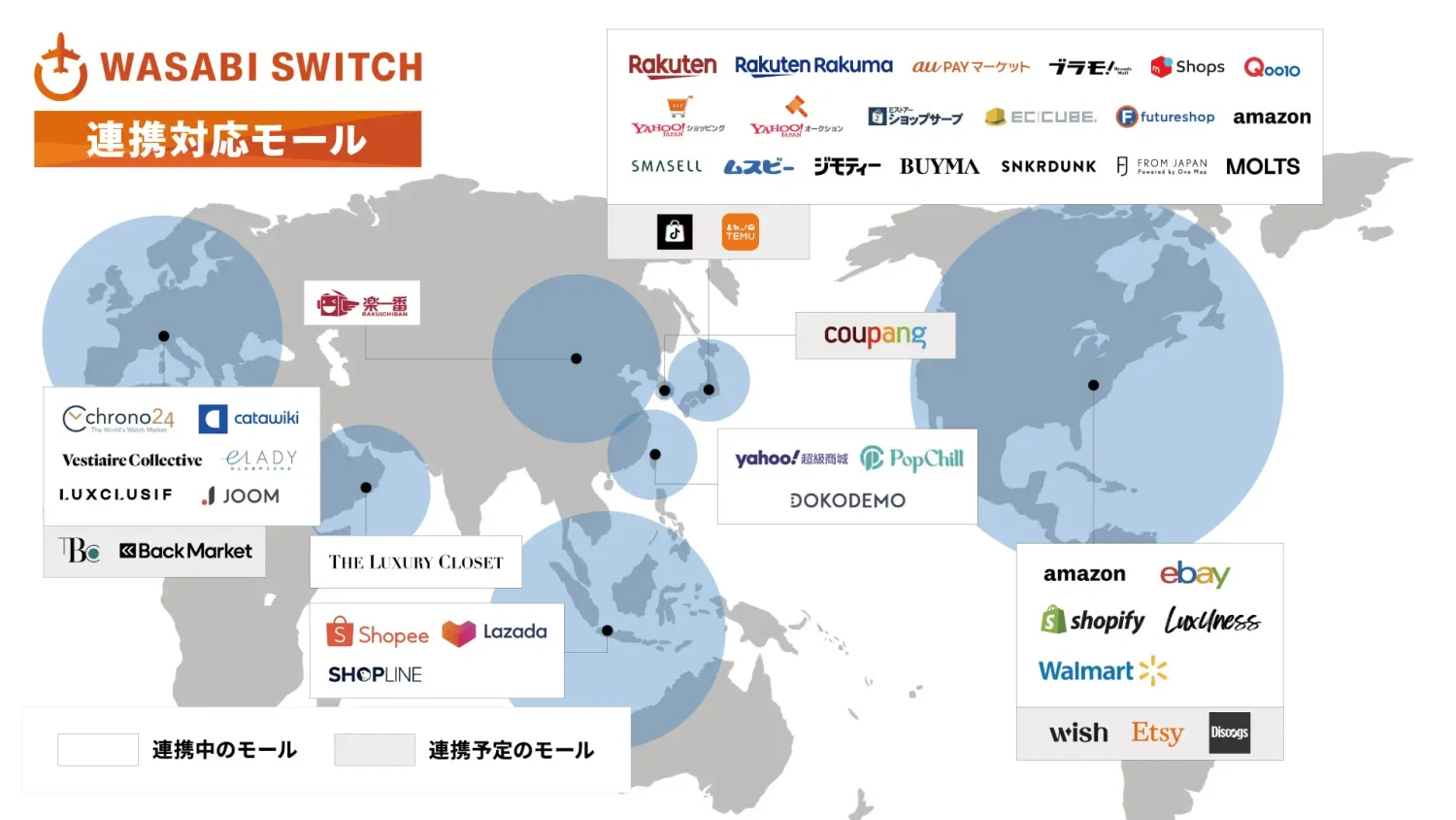 WASABI SWITCH(ワサビスイッチ)は、リユース品の流通業者を対象とし、世界の「販路拡大」と、リユース品特有の煩雑な業務の「効率化」を実現することを目指したクラウド型の販売管理システムです。その目標は、「EC業務を劇的に改善し、あらゆる効率化を目指す」ことにあります。