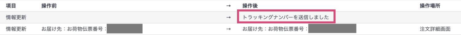 ・モール側にトラッキングナンバーを反映完了時、 操作履歴に「トラッキングナンバーを送信しました」の表示が出るよう改修を行いました。