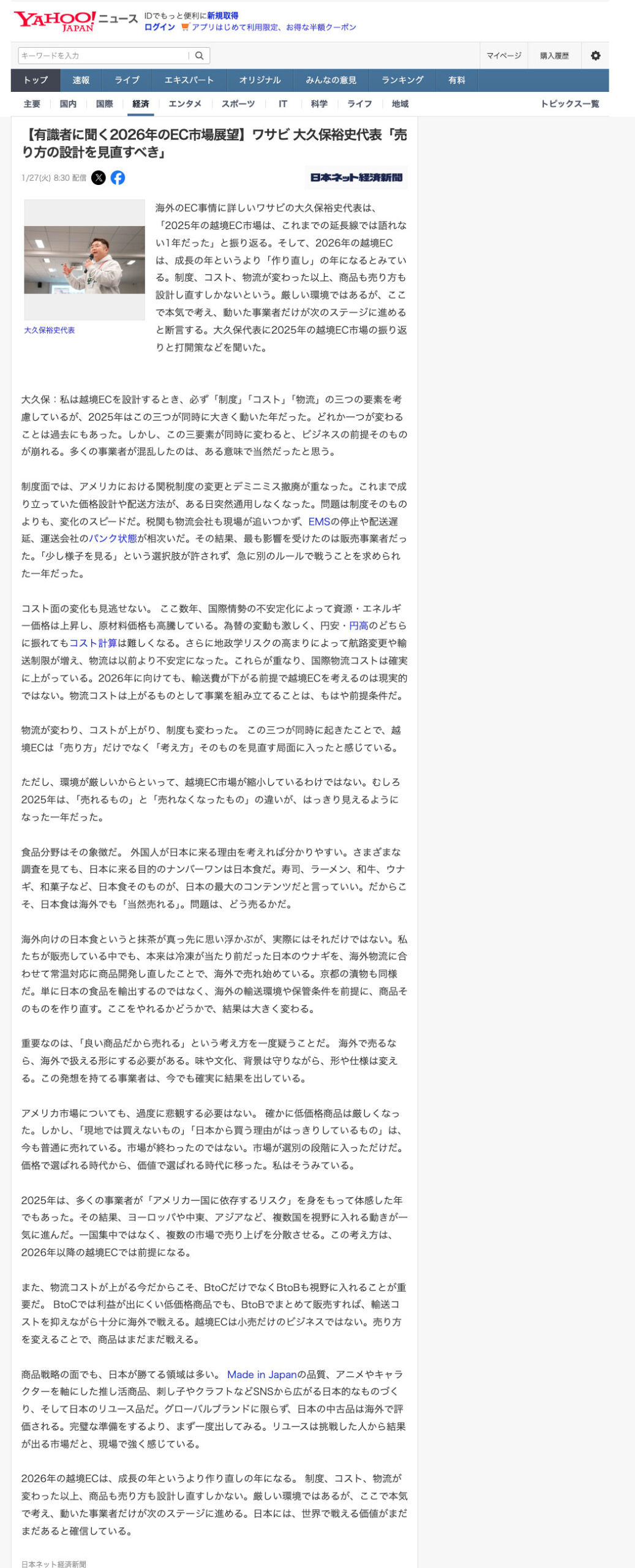 2026年1月27日、日本ネット経済新聞の特集「大手ECモール、有力事業者、有識者に聞く「2026年のEC市場展望」にて、弊社大久保の記事が掲載されました。