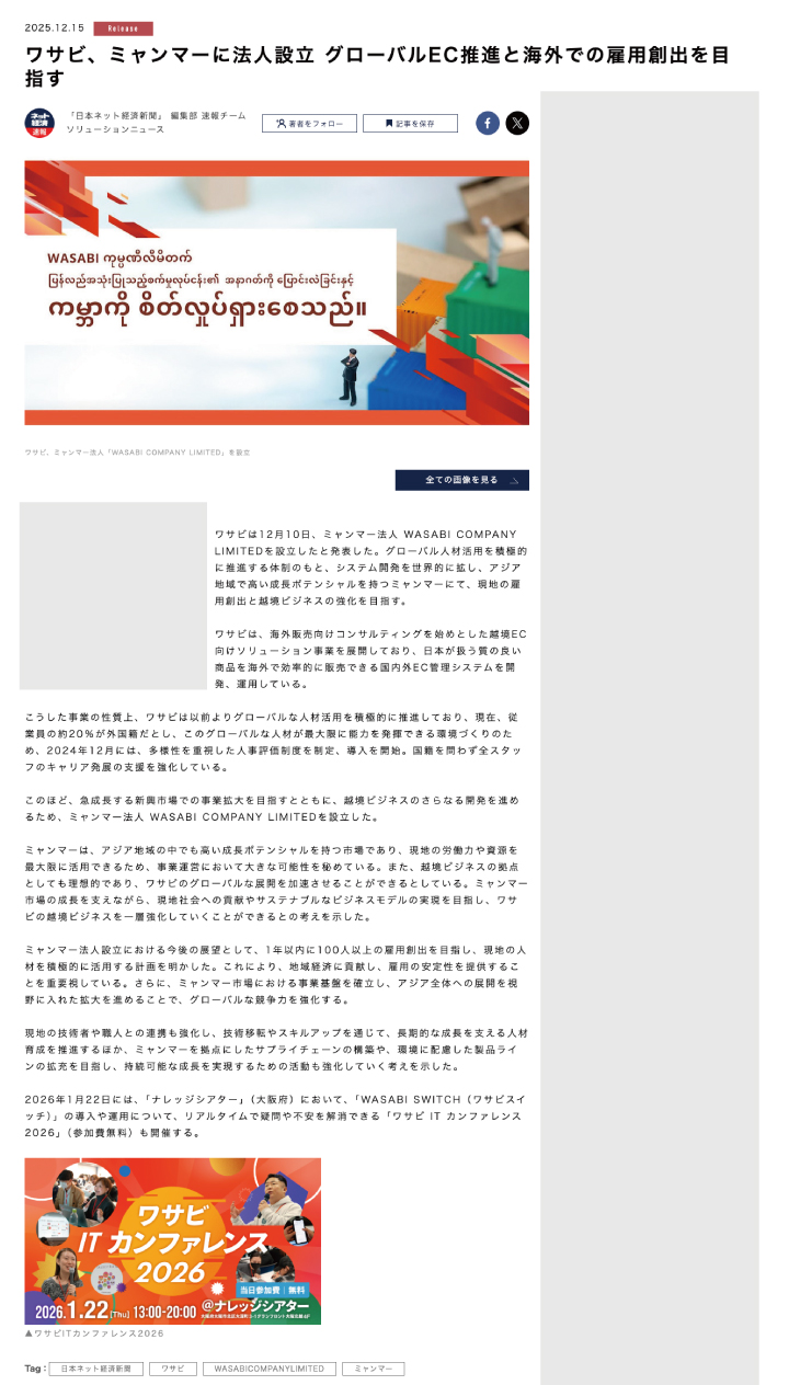 2025年12月15日、日本ネット経済新聞にて、弊社のミャンマー法人「WASABI COMPANY LIMITED」についての記事が掲載されました。