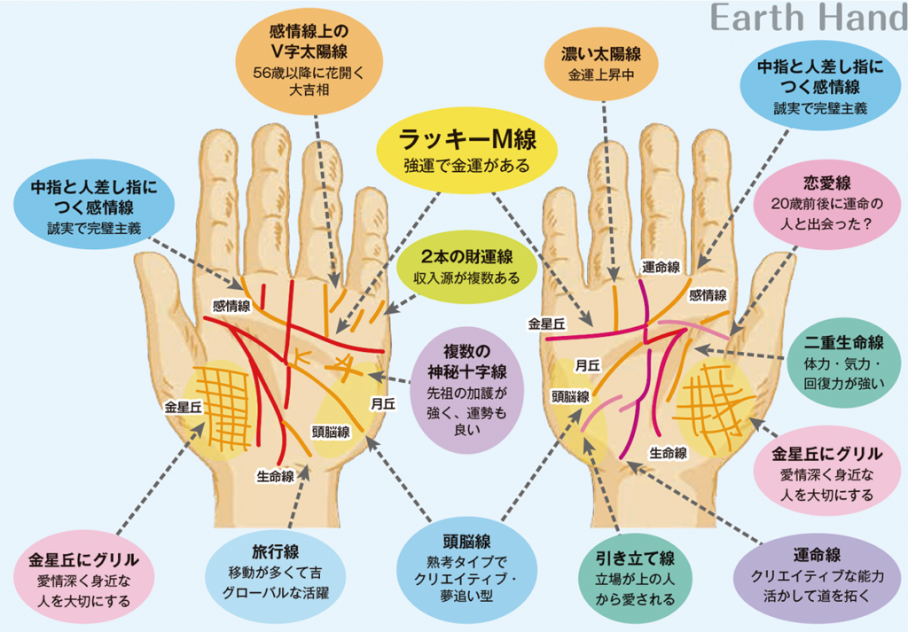 手相は身体の一部であり、脳に直結している手のひらに表れるものなので、日々刻々と変化していきます。生活習慣の影響、精神状態、健康状態が表れるます。そのため、手相は自分の内面や健康状態を知る手掛かりとなり、人生の方向性を考える手助けをしてくれるものだそうです。