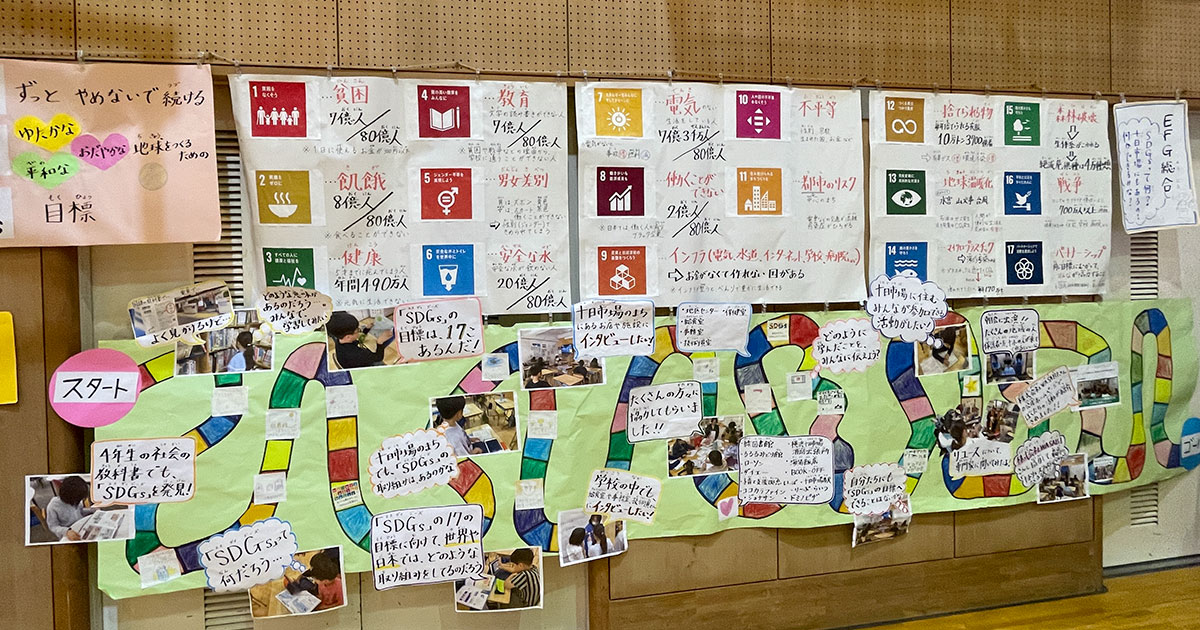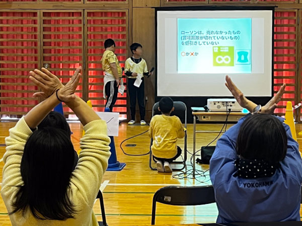 体育館に足を踏み入れると、そこにはSDGsの17の目標を分かりやすく解説したパネルや、子どもたちが十日市場のお店や施設をインタビューしてまとめた「十日市場のSDGs新聞」が並びます。また、当日は、子どもたちの司会のもと、SDGsにまつわる参加型○×クイズを実施し、理解を深めました。