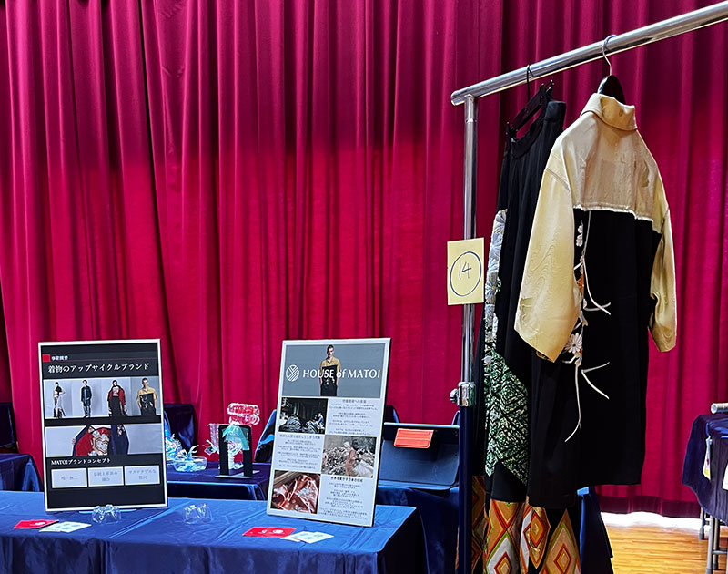 弊社からは、リユース着物を現代に作り替えるアップサイクルブランド「House of MATOI」のブースを設置。また、他社様からご提供いただいたプラスチックなどから新たなものを生み出すアップサイクル品の展示も数多く行いました。