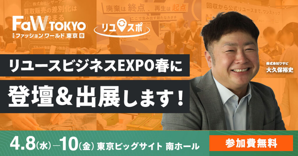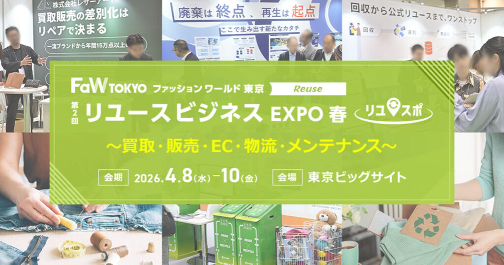 リユースビジネスEXPO(通称:リユスポ)は、ファッション業界の展示会FaW TOKYO (Fashion World Tokyo)の特別企画として、リユースビジネスに関連するサービスやソリューション、業界トレンドなどが紹介される展示会です。