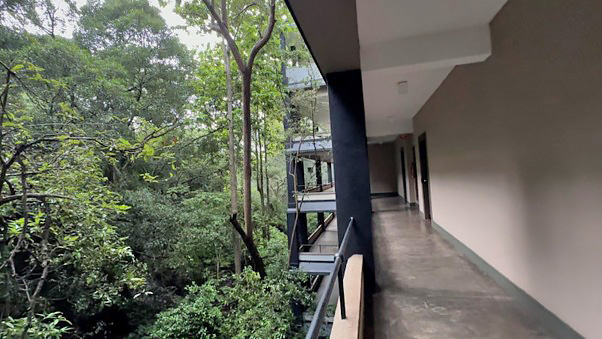 ジェフリー・バワの住宅兼事務所(通称No.11)は太陽の光が木漏れ日のように適度に差し込み、心地よい風がスウッと通っていきます。このような場所で仕事ができれば気持ちがいいでしょうね。シーギリヤ周辺の密林の中に建てられたリゾートホテル「ヘリタンス カンダラマ」は、屋外と屋内を遮るものがほぼなく、廊下やベランダのすぐ近くに森が広がっています。野生のサルやリスが部屋の中に入ってくるといったこともしばしば。でも、これこそがバワの理想とする空間なのです。
